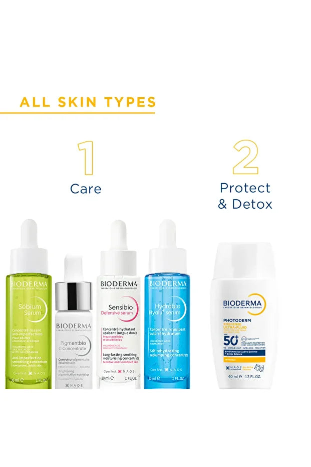(*by Bioderma) ECOBIOLOGICAL INNOVATION: PROTECT > ENVIRONMENTAL ACTIVE DEFENSE: Surface barrier and advanced biological protection against UV, visible light, infrared, and pollution.
