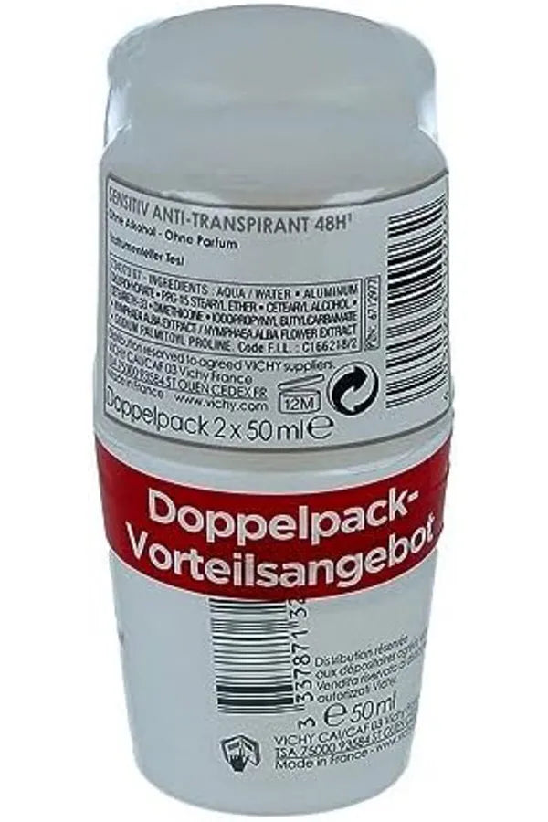 VICHY Deo Roll-On Sensitive Anti-Transpirant for 48 hours offers effective sweat and odor protection for sensitive skin.
